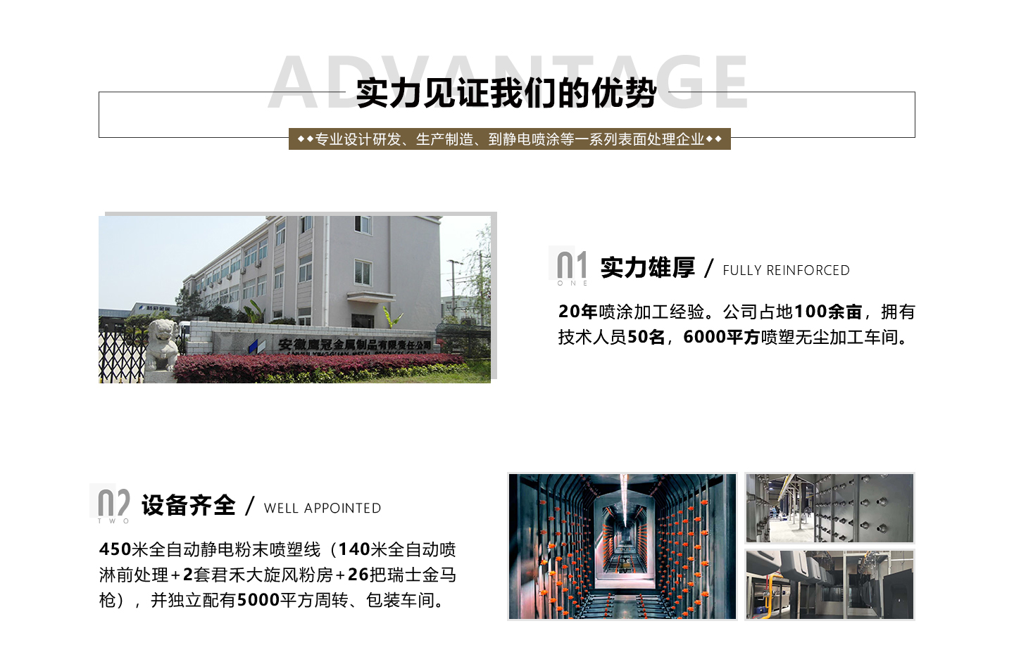 安徽鷹冠金屬制品有限責(zé)任公司座落于----安徽合肥新城開(kāi)發(fā)區(qū),占地100畝,總面積20000平方米,是國(guó)內(nèi)規(guī)模較大的彩鋼護(hù)欄型材研發(fā)生產(chǎn)基地之一。公司于一九九八年建廠(chǎng)至今,涉足大型零售商業(yè)、房地產(chǎn)行業(yè)近20年,已經(jīng)形成了從設(shè)計(jì)研發(fā)、生產(chǎn)制造、到靜電噴涂等一系列表面處理的專(zhuān)業(yè)團(tuán)隊(duì)。公司“新冠”彩鋼系列產(chǎn)品基材采用無(wú)縫鍍鋅鋼,雙面高溫?zé)徨冧\處理,表面處理使用阿克蘇諾貝爾公司的富鋅環(huán)氧涂層,聚酯彩色粉末涂層,經(jīng)二十多道防腐經(jīng)典噴涂工藝。產(chǎn)品具有出眾的防銹蝕、耐鹽霧、耐油煙、耐濕熱、耐刮擦的優(yōu)良特性。現(xiàn)公司擁有150名員工,其中技術(shù)人員20名,技工30名。2006年建立新冠彩鋼設(shè)計(jì)研發(fā)檢測(cè)中心,由多名...